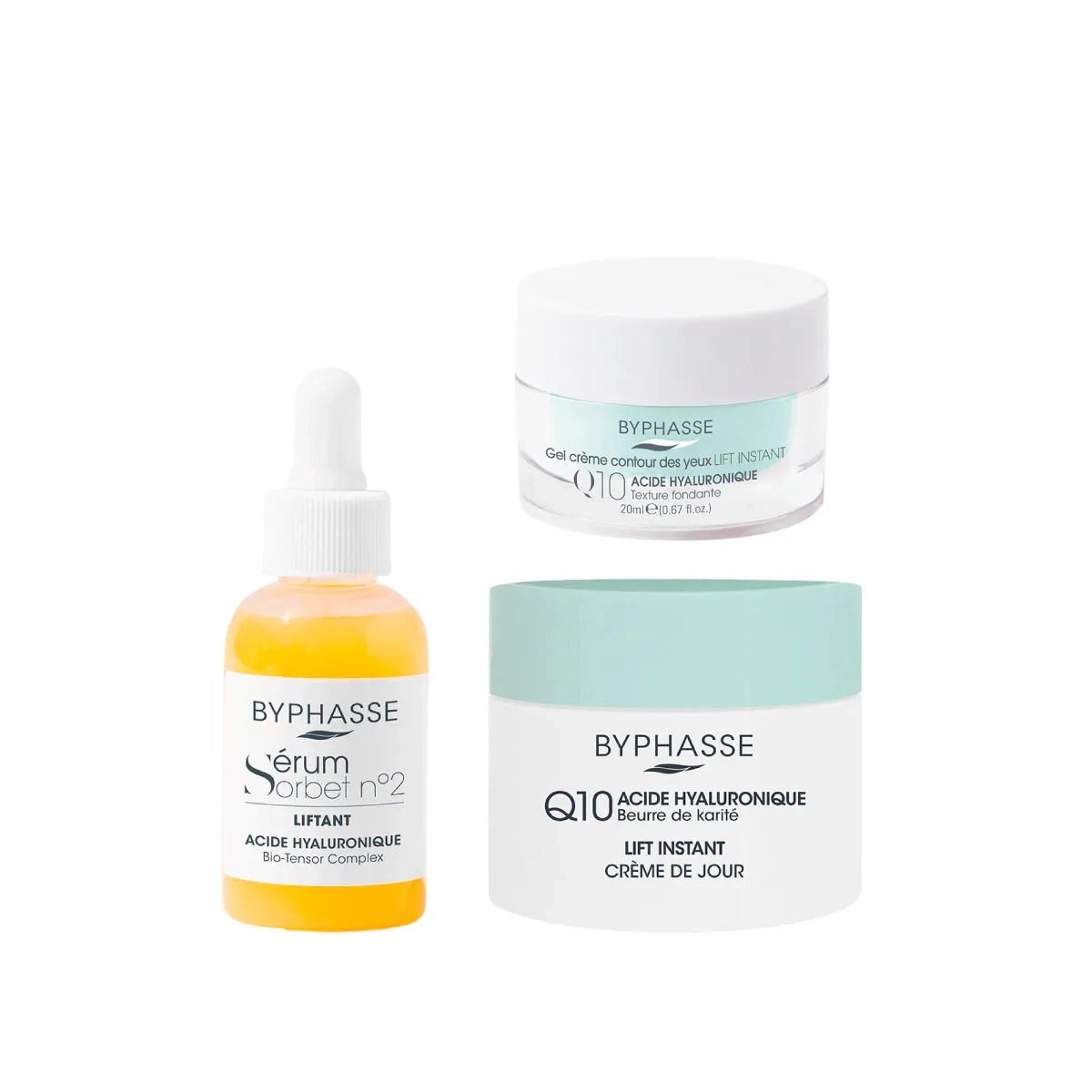 La rutina para piel madura AM incluye: Paso 1: Sérum facial reafirmante n2 Byphasse. Paso 2: Gel contorno de ojos q10 Byphasse. Paso 3: Crema dia Q10 y acido hialurónico Byphasse.