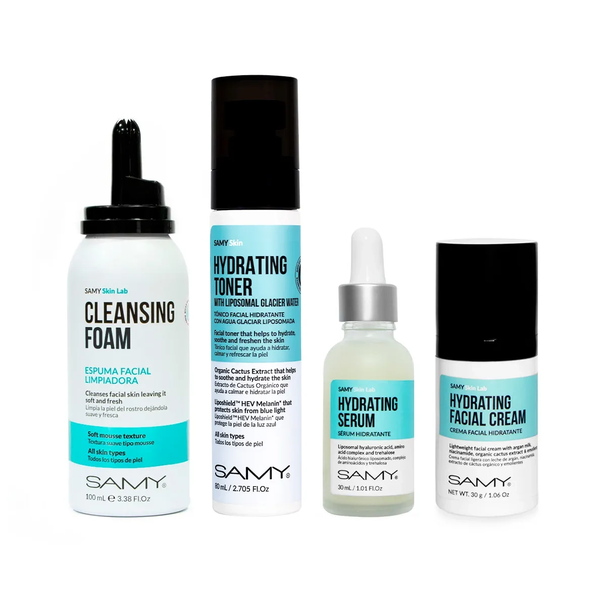La rutina para piel mixta a grasa diurna incluye: espuma facial limpiadora, mist hidratante, sérum hidratante y crema facial hidratante.