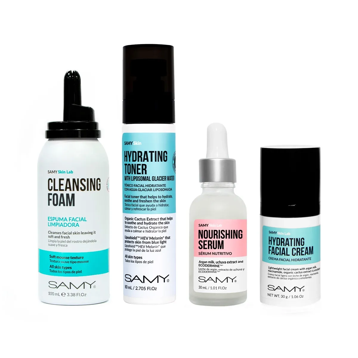 La rutina para piel normal a grasa diurna incluye: espuma facial limpiadora, mist hidratante, sérum nutritivo y la crema facial hidratante.